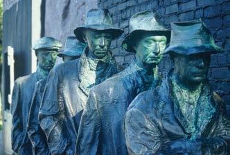 MEMORIAL is in West Potomac Park along the Tidal Basin. This expansive tribute to the nation’s 32nd president comprises five separate sections covering the four terms and 12 years (1933-45) FDR served. The outdoor «rooms» create an atmosphere that is a more secluded garden than an imposing monument. The Prologue Room contains a 10-foot statue of Roosevelt in a wheelchair, depicting the physical disability that inspired the man’s leadership. Room One focuses on FDR’s early presidential years. Sculptural groups in Room Two include a bread line— underscoring both the literal and figurative hunger many Americans experienced during the Depression years. In-Room