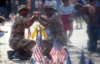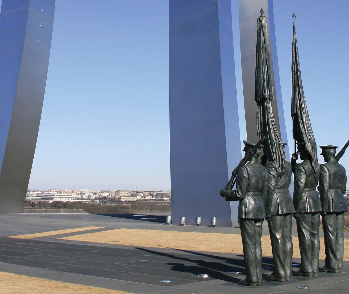 between the Lincoln Memorial and the Washington Monument. It honors the 16 million men and women who served in the U.S. armed forces during the war and the millions who supported the war effort at home. Twenty-four bronze bas-reliefs of various scenes related to the war years mark the ceremonial entrance. Two 43foot mark victories in the war’s two major theaters, Atlantic and Pacific. Radiating outward from the pavilions are 56 17-foottall granite pillars representing the District of Columbia and the existing U.S. states and territories at the time of the war. These pavilions with more than 4,000 sculpted gold stars represent the more than 400,000 Americans who died in service.