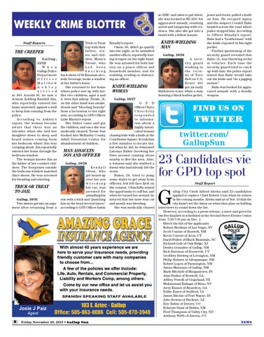 KNIFE-WIELDING MAN Gallup, 10/26 A secur it y g ua rd working in t he v ic i n ity of Taco Bell on U.S. Rout e 491 got an early Halloween scare when a man donning a black leather jacket,