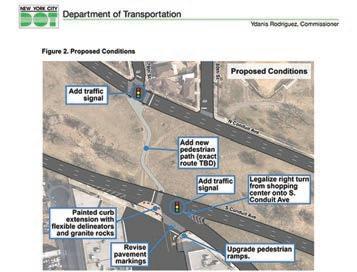 In a le er to stakeholders, DOT Queens Borough Commissioner Nicole Garcia noted that “the design is in response to numerous community and elected o cial requests for a safer pedestrian crossing between the north and south sides of Conduit Avenue across the grassy area.”