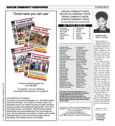 GOOD NEWS YOU CAN USE! Happy Holidays!!! Happy Kwanzaa. Plan to celebrate Kwanzaa at the American Museum of Natural History. It is an annual celebration. (see page 10) Also, plan to celebrate Kwanzaa with your family and friends. It is a great way to start the New Year. Next week we start a new year - 2018. I plan to be more conscientious about my food choices, spend more time exercising, rest more, “party more” and take Harlem News to the next level. I am sure most of us can improve our lives by being more organized. In this issue we offer you ways to cut through the chaos and stay organized in the New Year, as well as ways to better organize your medical information. (see page 21). Continue to have a safe and happy holiday season and remember to do some of that shopping and dine with small businesses in your community.. Happy New Year!
