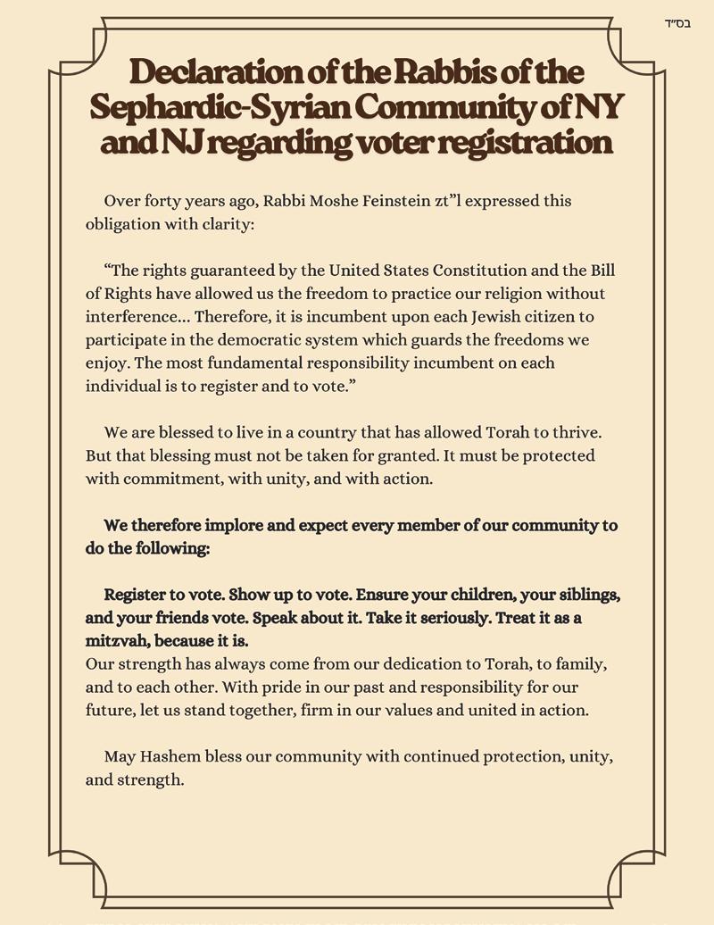 Our rabbis came together to pen a proclamation, stressing how vital it is for every eligible member of our community to register and vote. You’ll also find a message from New York State Senator Sam Sutton, reminding our community to take part in this November’s election, which will have a significant impact on New York City and the Jewish community.