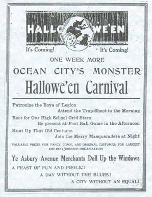 Afront page article in the October 12, 1922 Ocean city Sentinel reported, “All preliminary plans for the monster Hallowe’en c ar nival, to be conducted Saturday, October 28, under the auspices of the Young Men’s Progressive League, are nearing completion.” t he program was as follows: