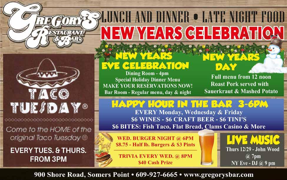 Bar Open Everyday 8am to 2am • Kitchen Open Everyday 11am to 1am 800 Shore Rd. • Somers Point • (609) 927-3663 www.charliesbar.com Serving our nearly famous Pork Roll, Egg and Cheese Sunday Breakfast 9am-11am Watch The Eagles Flyers and Sixers on 21 TVs! At the Shore Since '44 Annual New Years Eve Party! Celebrate with us! World Famous Wings & BBTs (Boneless Tenders) Entrees, Burgers, Sandwiches, Wraps, Soups, Nachos, Tacos and Fries.