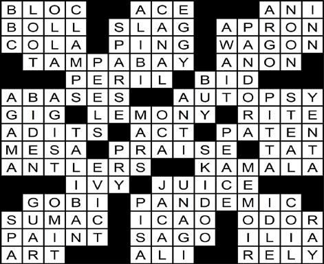 OPEN FROM 11AM CLOSED MONDAY 609-645-0500 SUDOKU Solution on page 58 ACROSS 1. Coalition of countries 5. King trump-er, sometimes 8. Cuckoo bird 11. ____ weevil 12. Smelting waste 13. Kitchen-wear 15. Coke or Pepsi 16. Check-in via text, email, etc. 17. Settler transport 18. *2021 Super b owl winner, two words 20. before long, to Shakespeare 21. Jeopardy 22. Auction action 23. Puts down 26. Coroner's performance 30. band booking 31. Snicket of "A Series of Unfortunate events" 34. Stravinsky's "The ____ of Spring" 35. Mine passages 37. *build back better ____ 38. eucharist plate 39. Table hill 40. Good review 42. "Tit for ____" 43. buck feature, pl. 45. *First female VP 47. evergreen creeper 48. It goes with gin, according to Snoop Dogg 50. Mongolian desert 52. *COVID-19, e.g. 55. Poison ivy or Poison oak 56. International Civil Aviation Org. 57. Distinctive smell 59. House coat 60. Asian cuisine food thickener 61. Pelvic parts 62. Gallery display 63. Self-proclaimed greatest boxer 64. Count on DOWN 1. "Monty Python" broadcaster 2. rioter's take 3. Cantina pot 4. Fasteners or holders 5. Cover story 6. *Suez ____, too tight for ever Given 7. Like custard 8. Mythological ship 9. "High" time 10. Wayside stop 12. Thinly spread 13. Look forward to 14. *____ Papers, leaked offshore account information 19. banana refuse, pl. 22. e xchange for money 23. Old World lizard 24. *January 20th honoree 25. Anti-elderly one 26. Those not in favor 27. Pita, alt. sp. 28. Take without asking 29. Gossiper, Yiddish 32. *Perseverance landing spot 33. edible tuber 36. *Kabul's organization in power 38. *The Nobel ____ Prize was awarded to ressa and Muratov 40. Snoop around 41. Snowmobile brand 44. Give the boot 46. *"Stronger" by Cindy McCain, e.g. 48. Southwestern hut 49. Sushi restaurant staple 50. ____ gum, food additive 51. Leave out 52. Home to the Leaning Tower 53. Not in use 54. One in mattress 55. Spot for a facial 58. *Actor Liotta, star in "The Many Saints of Newark"