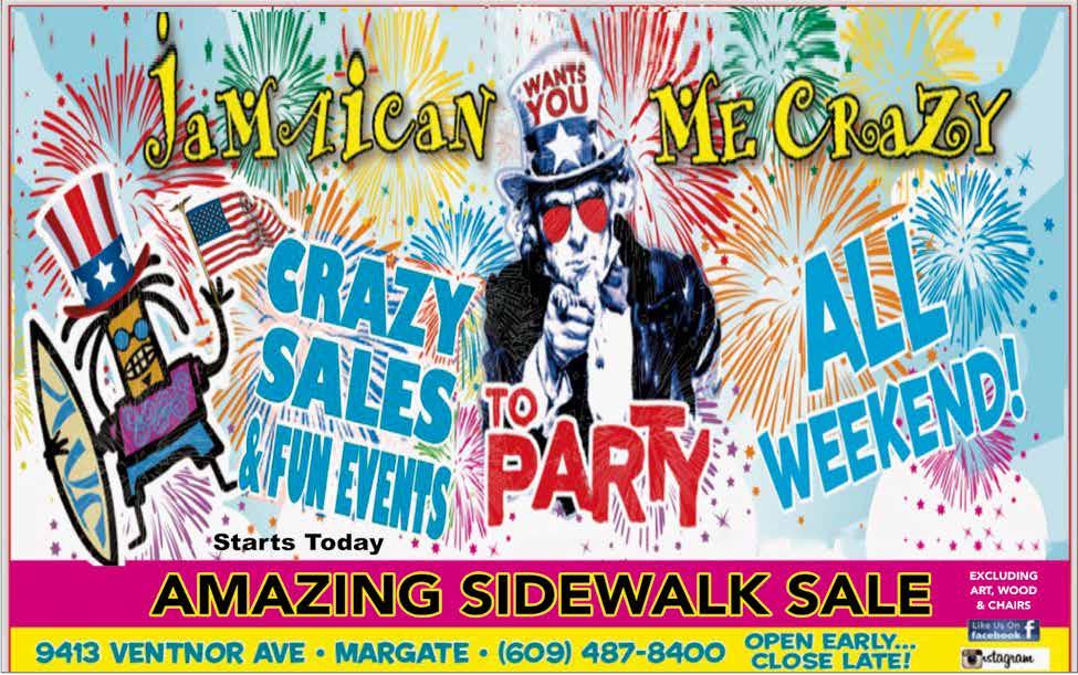 EASY IN & OUT Grab our Pre-Packaged Half Gallons & Cookie Sandwich Packages to go! 55th & West Avenue • Ocean City | Call for Hours (609) 398-2207 AMPLE FREE PARKING www.alamodeicecreamparlor.com ice cream cake for llarge and small parties. Bring the group to eat-in or takeout their favorite treats. With 30+ flavors, 37 sundaes, and 12 Banana Splits, we have something for everyone. (even dieters!) Havealargegroup onaRainyDay? EASY IN & OUT Grab our Pre-Packaged Half Gallons & Cookie Sandwich Packages to go! 2pm - 4:30pm Just mention "Rainy Day" to your server! RAINY DAY SPECIALS & West Avenue • O A www.alamo p "R Enjoy fresh, quality produce at wholesale prices. Santori's has the healthy food your family loves. Check out our produce specials on Specials Valid 6/29 thru 7/3 AMERICAN CHEESE...........................................................$4.99LB GOURMET LITE TURKEY BREAST.............................$8.99LB EXTRA LEAN ROAST BEEF............................................$9.69LB HOT PEPPER CHEDDAR CHEESE..................................$6.99LB BEEF BOLOGNA....................................................................$5.29LB BLACK PEPPER HAM........................................................$6.99LB HONEY BARBECUE CHICKEN BREAST.....................$6.99LB REGULAR OR BEEF HOT DOGS 2 (14 OZ) PKGS .......$7.00 STORE SLICED PROVOLONE CHEESE........................$5.29LB HORMEL DOMESTIC HAM............................................$4.99LB 510 New Road, Somers Point 609-927-4656 325 E. Jimmy Leeds Rd. Galloway 609-652-5252 Open Mon-Fri 8am-6pm Sat. 8am-5pm Sun. 9am-3pm RED OR GREEN PEPPERS THIS WEEK'S SPECIALS LARGE SWEET CANTALOUPES 2 LBS FOR $3.50 2 LBS FOR $2.00 2 LBS FOR $2.50 2 LBS FOR $2.50 EACH $2.99 LARGE VINE RIPENED TOMATOES SWEET CHERRIES JERSEY PEACHES 2 LBS FOR $3.00 HAPPY FOUTH OF JULY 3 June 29, 2023