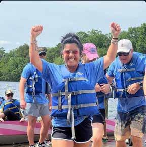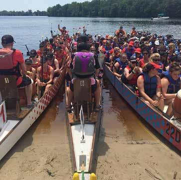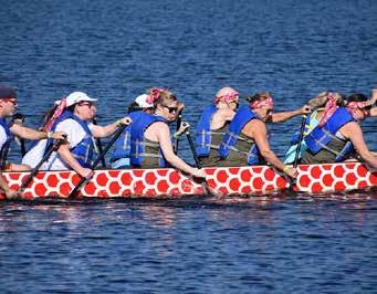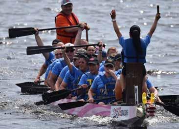 heats. At lunchtime there is a break in the racing while a longtime member of CSCNJ reads a heartfelt poem while cancer survivors take to the lake for a Flower Ceremony, honoring those lost to cancer as well as those still fighting. This brings a moment of reflection to the crowd of well over one thousand people. After the final races in the afternoon, the Awards Ceremony takes place where winners of the day’s races go home with either a gold, silver, or bronze medal from their racing category.