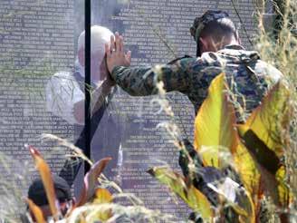 picted a reenactment scene on one side of a replica Vietnam Veterans