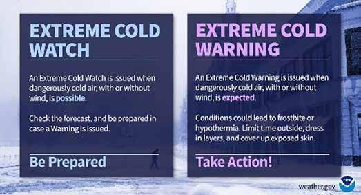 Cold Weather Advisory: Whenever the wind chill or air temperature is expected to be -10 to -24 degrees.