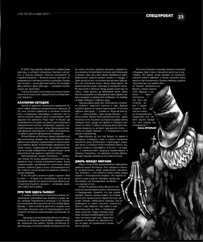 В эту ночь Самайн открывает ворота в прошлое и будущее. Две стихии становятся доступны в нас тоящем. Это время, когда человек не ограничен клеткой своего времени и может осознать свое место в паутине вечности. Однако переход в другое пространство или время обыч но бывает болезненным. Ворота хорошо охраня ются. Ведьмы и де моны — герои Хэллоуина — это тени хра нителей во рот. С нашей стороны бы тия они кажут ся пугающими воп лощениями зла. Но если ворота пройде ны, кого увидим мы, оглянувшись?.. Антон АРСЕНЬЕВ