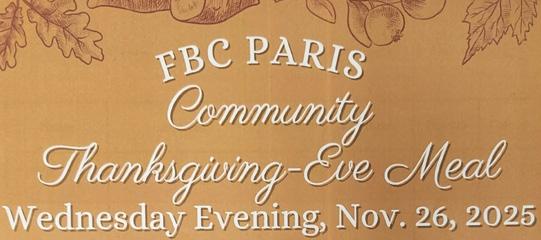 Paris, Tenn.–The First Baptist Church of Paris will serve a Community Thanksgiving-Eve Dinner this year on Wednesday, November 26. Other years, it has been served on Thanksgiving Day, but it has been changed to