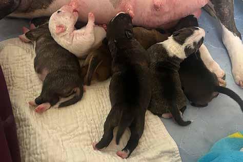 The first two weeks of whelping a litter may seem like not much to do, and you may think the mother does everything. It’s actually the most tiring time, at least with bull terriers. I have been up frequently all night making sure the puppies are nursing and their mom is comfortable. Changing the bedding in the box seems like a nonstop process, as well as hand-feeding Miki, who has decided she shall not eat any other way, and trying to keep these babies still to cut their sharp little nails. It is exhausting but an absolute labor of love. If you have any questions, please feel free to email heidi@fouronthefloordogtraining.net.