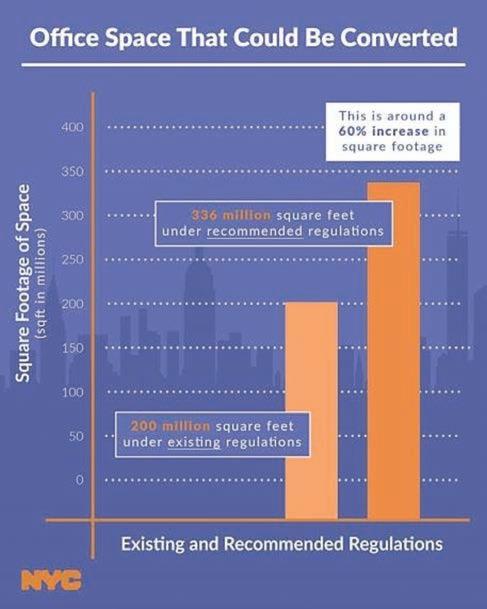 Mayor Eric Adams on Monday unveiled recommendations from a city-led task force to facilitate the conversion of underused ofce space into new housing for New Yorkers. Cra ed by the O ce Adaptive Reuse Task Force, and led by New York City Department of City Planning (DCP) Director Dan Garodnick, the New York City O ce Adaptive Reuse Study presents 11 concrete recommendations that would make changes to state laws and city zoning requirements in an e ort to extend the most exible conversion regulations to an additional 136 million square feet of o ce space — roughly the amount of o ce space in the entire city of Philadelphia. While property owners will make determinations whether to convert their buildings, with these recommendations in place and current city and state regulations, o ce conversions could potentially create as many as 20,000 homes in the next decade, enough to house up to 40,000 New Yorkers.