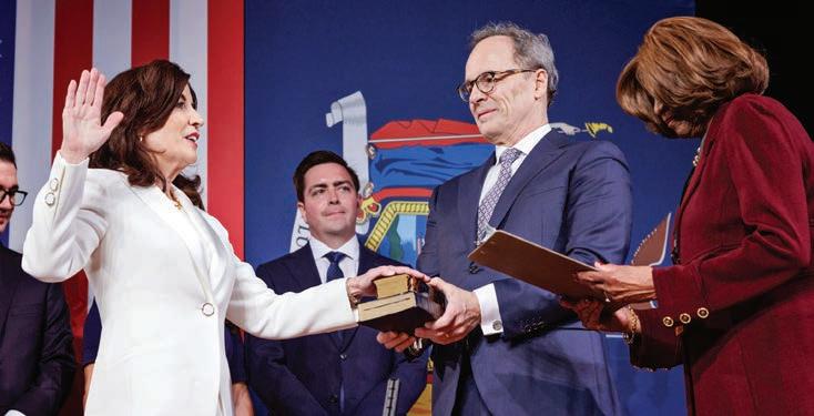 “To paraphrase one of our former governors, Teddy Roosevelt, ‘ e people have now chosen a woman to be in the arena.’ You’ve heard of the man in the arena. ere’s now a woman in the arena. And that man and that woman are willing to be marred by dust and sweat and blood to strive valiantly and spend herself in a worthy cause,” Hochul said in a stirring inaugural address. “As the sign says, I didn't come here to make history. I came here to make a di erence. And to pursue the worthy causes, pursue them together. And as your Governor, I'll keep ghting for you every single day. And this is what I know about New Yorkers, just like the Lieutenant Governor, Lieutenant Governors do a lot of traveling. I know every corner of this state. New Yorkers are tough. ey're undeterred. ey're unafraid. We're also innovators and creators. We can be optimists and realists, dreamers and doers. But above all, when we are united, there's no stopping us. And there is no ght for what is right that we will ever back down from.”