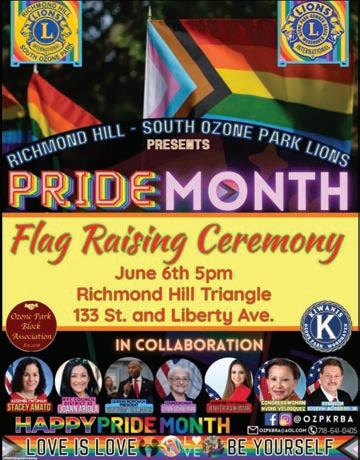 On Tuesday, June 6, at 5 p.m., the Richmond Hill-South Ozone Park Lions Club, in collaboration with the Ozone Park Howard Beach Woodhaven Lions Club, the Ozone Park-Woodhaven Kiwanis Club, and the Ozone Park Residents Block Association-ozpkrba, with the blessings and support of US Congress Member Nydia Velasquez (7), NYS Senator Joseph Addabbo (15), NYS Assembly Member Stacey Pheffer-Amato (23), NYS Assembly Member Jenifer Rajkumar (38), Queens Boro President Donovan Richards, NYC Council Member Lynn Schulman (29), NYC Council Member Joann Ariola (32) will host the 2nd annual official Gay Pride Flag Raising ceremony. The event is the only official event that celebrates Pride in or around any of our communities on public land.