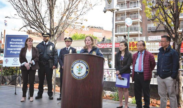 Queens District A orney Melinda Katz joined by NYPD o cials, members of the Flushing business community and elected o cials last week to announce the Flushing Merchants Business Improvement Program to enhance safety for retailers and shoppers by discouraging unwanted activity in and around local stores. e initiative is based on a successful launch of the Jamaica Merchants Business Improvement Program.