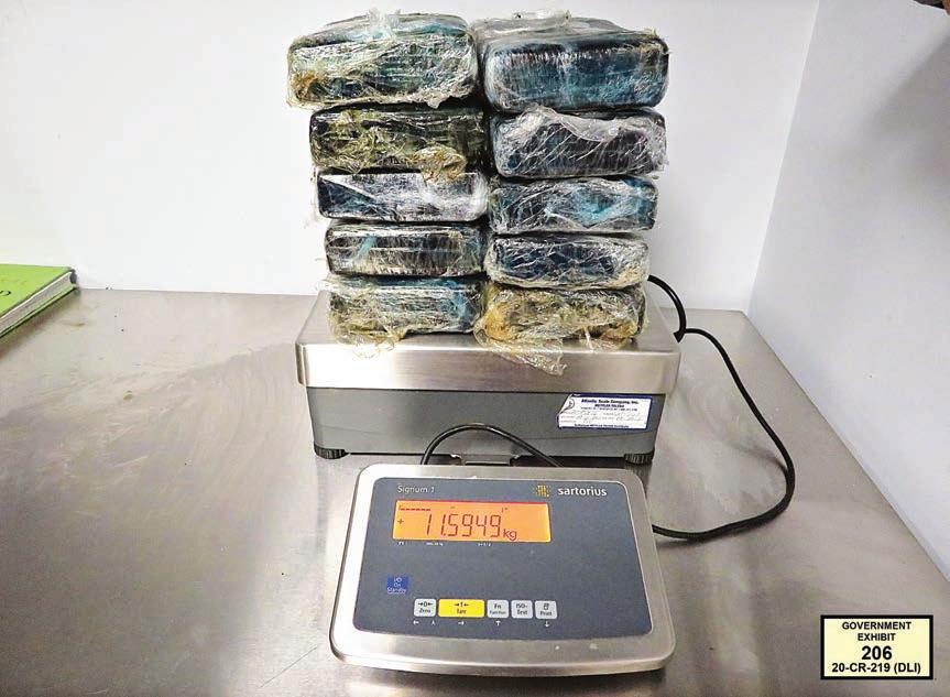 As proven at trial, on Feb. 4, 2020, American Airlines ight 1349 arrived at JFK Airport’s Terminal 8 from Montego Bay, Jamaica. e aircra was selected for a routine search by CBP o cers from the JFK Airport Anti-Terrorism Contraband Enforcement Team. e o cers found 10 bricks of cocaine weighing 25.56 pounds—hidden inside an electronics compartment on the underside of the cockpit. e cocaine was replaced with fake bricks and sprayed with a substance that glows when illuminated with a special light. CBP o cers and HSI special agents placed the aircra under surveillance