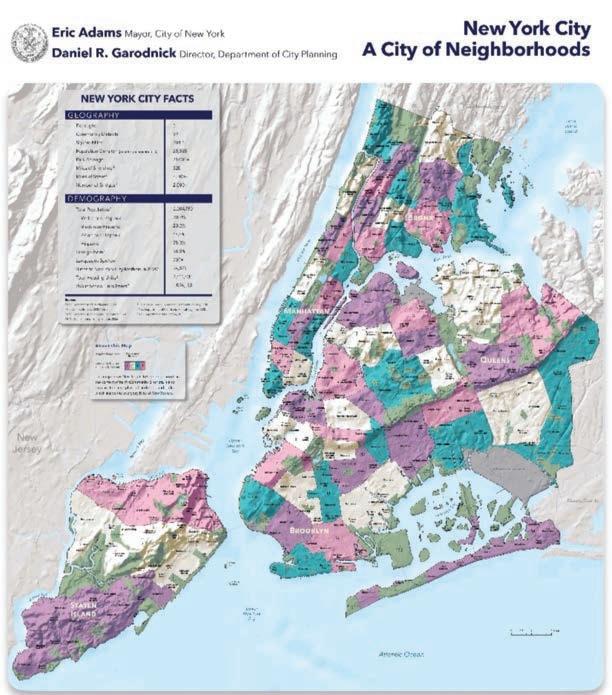 According to DCP, this 2022 edition of the map – which was rst published in 1994 – be er represents the hills, valleys, and ridges that de ne the unique contours of New York City neighborhoods and our surrounding waterways – which have inspired many neigh borhood names – than previous maps have.