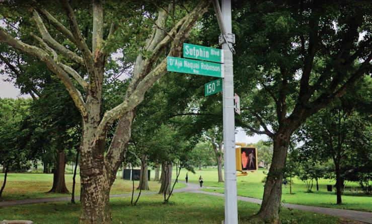 D’Aja Robinson, a 14-year-old honor student at the Campus Magnet School, was killed May 18, 2013, when 10 .40-caliber pistol rounds were fired into a crowded city bus in a gangrelated dispute. An innocent bystander, Robinson was on the bus heading home from a friend’s birthday party. Her sense less murder devastated her close-knit fam ily and touched the community deeply. The corner of Sutphin Boulevard and 150th Street is now named for her.