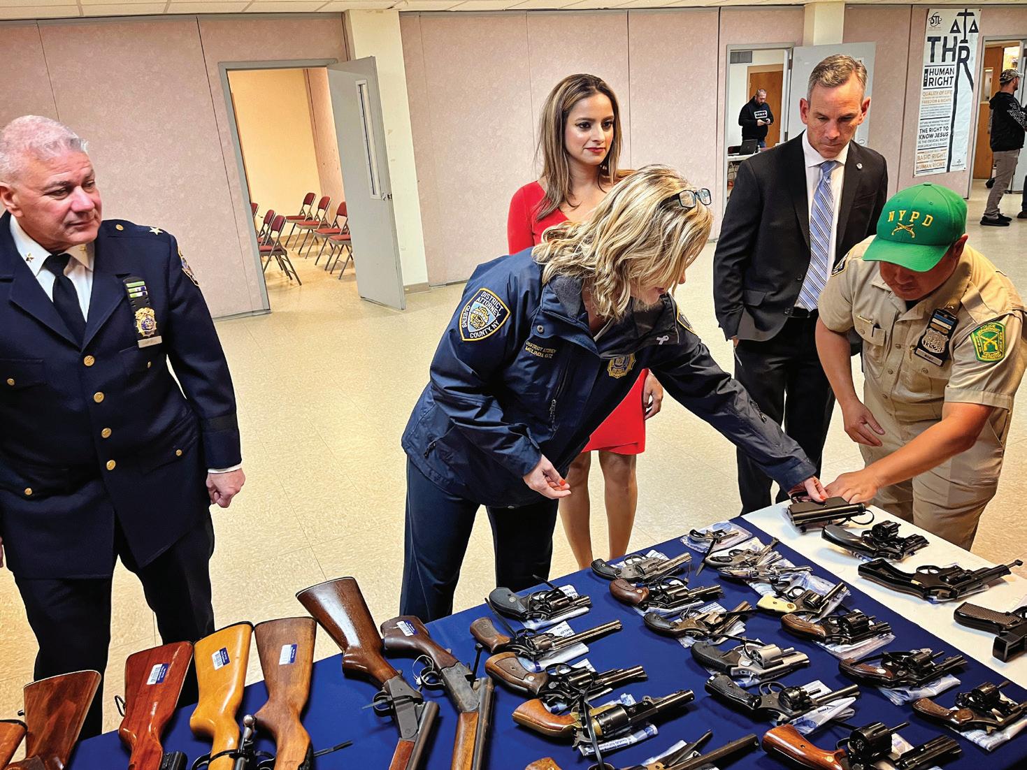 Photo Courtesy of DA Katz More than 60 firearms were collected Saturday at Calvary Assembly of God Church in Ozone Park.Pol Preps for Food, Clothing Drive