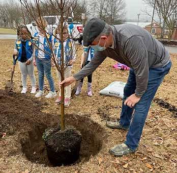 Tree Commission Chairman Eric Frederick teaches Girl Scout Troop 30679 how to properly plant tree.