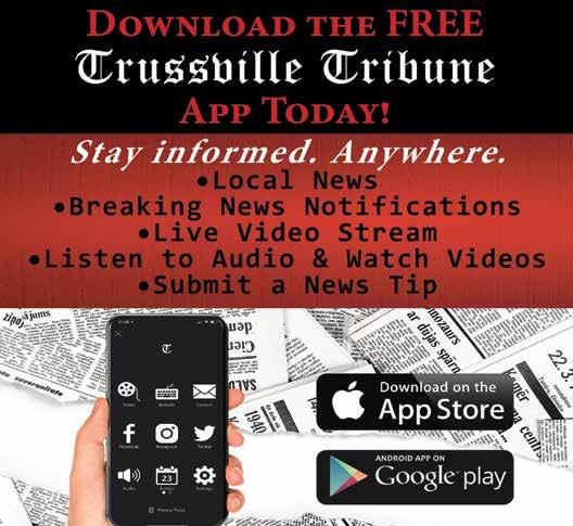 www.TrussvilleTribune.com 2023 THU WED FRI SAT SUN MON TUE TRUSSVILLE • ARGO • MOODY • PINSON • CLAY • CENTER POINT • SPRINGVILLE LEEDS • MOODY • TRUSSVILLE • PINSON • CLAY • CENTER POINT • ARGO SPRINGVILLE • TRUSSVILLE • LEEDS • MOODY • PINSON • CLAY • CENTER POINT • ARGO • SPRINGVILLE • TRUSSVILLE • LEEDS • MOODY • PINSON CLAY CENTER POINT • ARGO • SPRINGVILLE • LEEDS • MOODY • TRUSSVILLE PINSON • CLAY • CENTER POINT • ARGO • SPRINGVILLE • ARGO • SPRINGVILLE PINSON • CLAY • CENTER POINT • ARGO • SPRINGVILLE • LEEDS • MOODY TRUSSVILLE • PINSON • CLAY • CENTER POINT • ARGO • SPRINGVILLE • LEEDS MOODY • TRUSSVILLE • PINSON·CLAY • CENTER POINT • ARGO SPRINGVILLE • LEEDS • MOODY • TRUSSVILLE • PINSON • CLAY • CENTER POINT • ARGO SPRINGVILLE • LEEDS • MOODY • TRUSSVILLE • PINSON • CENTER POINT TRUSSVILLE • ARGO • MOODY • PINSON • CLAY • CENTER POINT • SPRINGVILLE The Tribune March 1 - 7 Inside the Tribune News - Pages 1-7 Opinion - Page 8 Outdoors - Page 9 Obituary - Page 10 Calendar - Page 11 Classified - Page 11 Sports - Pages 12-14