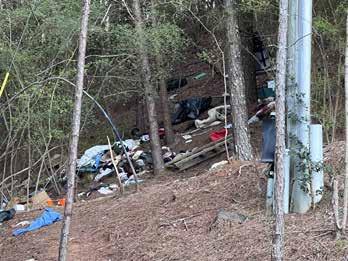 Summers said he has met with Beau Gregory, vice president of the Lovelady Center, who thanked the city for offering to help with the situation. A trail leading to the encampment is littered with items stolen from donation bins at the thrift store. Summers said it is likely some metal items are being removed and sold for scrap.