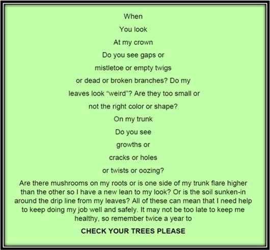 We all benefit from the trees around us. Besides pro viding us with oxygen and shade, they provide habitat for birds, insects, and ani mals; they protect our soil and waterways; they give our children places to play, and they increase our proper ty values. What’s not to love about a healthy tree? And that is why I have only one request: Check Your Trees, Please!