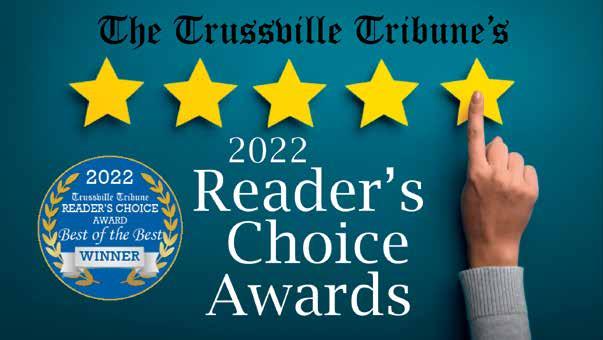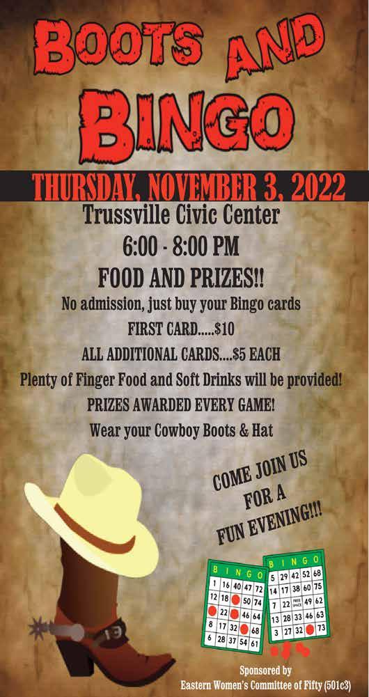 www.TrussvilleTribune.com 2022 WEDTHU FRI SAT SUN MON TUE October 19 - 25 TRUSSVILLE • ARGO • MOODY • PINSON • CLAY • CENTER POINT • SPRINGVILLE LEEDS • MOODY • TRUSSVILLE • PINSON • CLAY • CENTER POINT • ARGO SPRINGVILLE • TRUSSVILLE • LEEDS • MOODY • PINSON • CLAY • CENTER POINT • ARGO • SPRINGVILLE • TRUSSVILLE • LEEDS • MOODY • PINSON CLAY CENTER POINT • ARGO • SPRINGVILLE • LEEDS • MOODY • TRUSSVILLE PINSON • CLAY • CENTER POINT • ARGO • SPRINGVILLE • ARGO • SPRINGVILLE PINSON • CLAY • CENTER POINT • ARGO • SPRINGVILLE • LEEDS • MOODY TRUSSVILLE • PINSON • CLAY • CENTER POINT • ARGO • SPRINGVILLE • LEEDS MOODY • TRUSSVILLE • PINSON·CLAY • CENTER POINT • ARGO SPRINGVILLE • LEEDS • MOODY • TRUSSVILLE • PINSON • CLAY • CENTER POINT • ARGO SPRINGVILLE • LEEDS • MOODY • TRUSSVILLE • PINSON • CENTER POINT TRUSSVILLE • ARGO • MOODY • PINSON • CLAY • CENTER POINT • SPRINGVILLE The Tribune TERP Inside the Tribune News - Pages 1-6 Opinion - Page 7 Outdoors - Page 8 Calendar - Page 9 Classified - Page 9 Obituary - Page 10 Sports - Pages 11-14