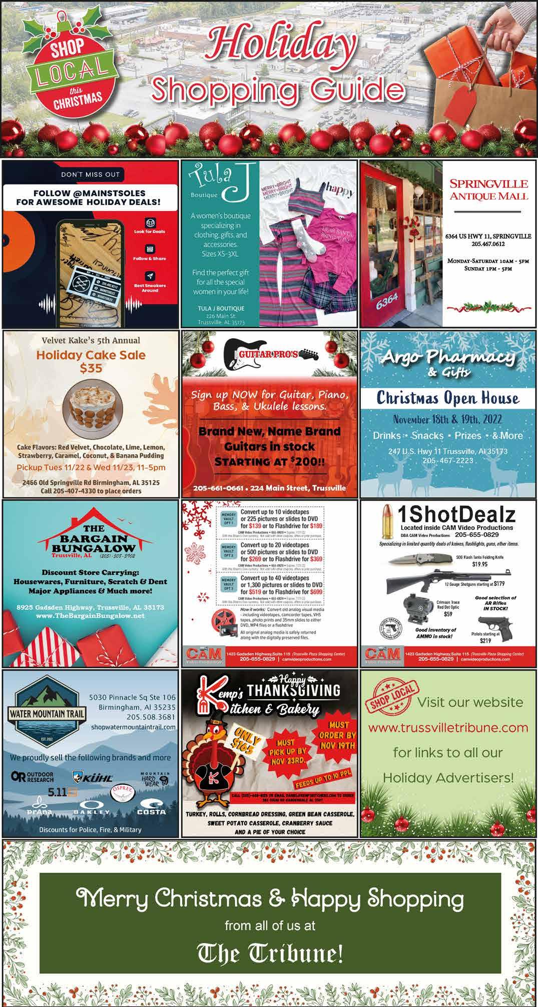 www.TrussvilleTribune.com 2022 THU WED FRI SAT SUN MON TUE TRUSSVILLE • ARGO • MOODY • PINSON • CLAY • CENTER POINT • SPRINGVILLE LEEDS • MOODY • TRUSSVILLE • PINSON • CLAY • CENTER POINT • ARGO SPRINGVILLE • TRUSSVILLE • LEEDS • MOODY • PINSON • CLAY • CENTER POINT • ARGO • SPRINGVILLE • TRUSSVILLE • LEEDS • MOODY • PINSON CLAY CENTER POINT • ARGO • SPRINGVILLE • LEEDS • MOODY • TRUSSVILLE PINSON • CLAY • CENTER POINT • ARGO • SPRINGVILLE • ARGO • SPRINGVILLE PINSON • CLAY • CENTER POINT • ARGO • SPRINGVILLE • LEEDS • MOODY TRUSSVILLE • PINSON • CLAY • CENTER POINT • ARGO • SPRINGVILLE • LEEDS MOODY • TRUSSVILLE • PINSON·CLAY • CENTER POINT • ARGO SPRINGVILLE • LEEDS • MOODY • TRUSSVILLE • PINSON • CLAY • CENTER POINT • ARGO SPRINGVILLE • LEEDS • MOODY • TRUSSVILLE • PINSON • CENTER POINT TRUSSVILLE • ARGO • MOODY • PINSON • CLAY • CENTER POINT • SPRINGVILLE The Tribune November 9 - 15 Inside the Tribune News - Pages 1-7 Opinion - Page 8 Calendar - Page 9 Classified - Page 9 Obituary - Page 10 Sports - Pages 11-16