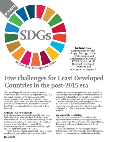 Getting SDGs on the agenda In development and policy circles, the SDGs have been hotly debated, but it is a mistake to think they are on everyone’s radar. This may be as true for ordinary citizens in rich countries, as it is in poorer parts of the world. At the same time, those who are responsible for implementing the goals can be overwhelmed by targets and lose sight of the spirit of the SDGs. The irony is this: much progress can be made towards development goals without reference to them. But 28 MakingIt