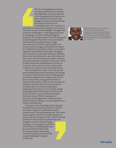 The rise of emerging economies is not merely a phenomenon related to their high rates of economic growth or increased geopolitical importance. Many of these countries have also managed to realize unforeseen levels of technical innovation and knowledge creation. For example, we encounter novel ideas emanating from new centres of science, research and knowledge in Shanghai, Rio de Janeiro and Bangalore. A thriving private sector in emerging economies is shifting the global landscape of innovation. Research and development in India has grown threefold over the past decade. China has become a global hub for energy innovation and is now the world’s number one investor in clean energy. And Brazil has developed the world’s first sustainable biofuels economy from sugarcane-based ethanol. Many other emerging economies, such as Colombia, Indonesia, Malaysia, Mexico and South Africa, have also built cultures of innovation. These developments, and the technical innovations they have spurred, would not have been possible without the establishment of conducive economic environments in these countries that enabled local entrepreneurs to realize their ideas. These entrepreneurs often react to the special needs and problems faced by people in developing economies. With their new ways of thinking, these innovators change the lives of the people in their home countries by creating solutions that are tailored to the realities of their local environments. And these solutions often have the potential to benefit people in countries facing similar challenges to development. For example, simple technologies that revolutionize the lives of rural farmers in China can be equally beneficial for farmers in Kenya. With the emergence of innovative technology-based enterprises in the Global South, knowledge can increasingly flow in a South-South direction. To let innovative technologies and techniques benefit the lives of people around the world, it is necessary to forge new collaborations across countries and to intensify existing ones. The United Nations system, with its broad representation in most countries and regions of the world, is the ideal facilitator to foster inclusive partnerships and strengthen South-South knowledge exchange. One important way that the United Nations is fulfilling this role is the annual Global South-South Development Expo, showcasing successful Southern solutions to the complex challenges facing the South today.