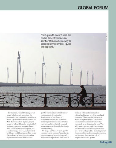 growth. These collaborative forms of economic activity rest on the development of new forms of entrepreneurialism and alternative monetary systems, like local or virtual currencies, which establish a second monetary system alongside fractionalreserve banking. We might call this new post-growth economy a ‘civil economy’, a productive economic system beyond the growth imperative that promotes every kind of
