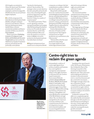 Centre-right tries to reclaim the green agenda A transatlantic coalition of centre-right figures from politics, academia and business has come together to reinvigorate environmental debate on the right of politics. In February 2014, the Londonbased Conservative Environment Network published Responsibility and Resilience: What the Environment means to Conservatives, with contributions from Arnold Schwarzenegger, former New York mayor Michael Bloomberg, Paul Polman of Unilever, Ian Cheshire of Kingfisher, and James Wolfensohn, ex-president of the World Bank, amongst others. The core themes that emerged from the report are economic resilience and competitiveness, the facilitation of competition via open environmental markets, and reconnecting with historic definitions of Conservatism.
