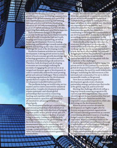In the last two decades, increasing economic growth rates in many developing countries have reshaped the global economy and opened up new opportunities for learning and entering into new activities and sectors. Developing countries are not only accumulating valuable sources of capital and labour but they are also improving their skills and capacities to innovate. Such continuous changes in the global economic landscape have been characterized by a shift of wealth towards the East and South, shaping new forms of promoting, as well as financing, development. However, leading technology and knowledge towards sustainable growth and moving up the value chain is still a challenge for most of the developing world. Productive business activities are central to development. A strong private sector is a key driver of local economic growth, knowledge and technology generation, job creation and the provision of fundamental goods and services. Therefore, both developed and developing economies are increasingly realizing the necessity of engaging the private sector as an integral and dynamic agent of development, in order to sustainably address the most pressing global and national challenges. This is central to continuing negotiations for the development agenda that is to replace the Millennium Development Goals (MDGs) beyond 2015. The problems facing our world today are too massive and too interconnected for unilateral approaches. Complex development priorities require systematic and vibrant global partnerships that succeed in connecting funding and expertise with local resources, implementation capacities and ownership – all essential for advancing towards our shared goals. The development landscape contains many aspirational partnerships which fall short of implementing their bold objectives of bringing together public sector, private sector, and civil society entities to improve the lives of people living in poverty. Common pitfalls include misalignments between the global strategy and the local execution; a lack of common measurement systems for monitoring and assessing progress; inadequate structures to manage complexity; inability to create shared value; and insufficient resources to guarantee sustainability.