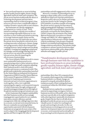 gender equality, human rights, climate change, agriculture and food, water and corruption. The private sector has been traditionally the driver of technology development and innovation, representing a hub for technical progress. It has, moreover, proven to have considerable ability to combine inventive capacity with access to finance. But businesses are already engaging in development in a variety of ways â from initiatives seeking to identify new models of incorporating responsible behaviour in core activities, to more traditional initiatives striving to leverage business supply chains and the production process. One particular area where the private sector has played a critical role is in creating innovative solutions to climate change and energy security, which often demand fine coupling between capital and ground-breaking capability. Creating and engaging in platforms for dialogue and knowledge sharing with the private sector can unlock the potential of relevant actors, directly impacting the effectiveness of partnerships. The Green Industry Platformâs work to ensure more sustainable business practices in manufacturing refers to these initiatives, driven largely by large and small companies adjusting their business model to deal with todayâs complex and resource-constrained world. This global multi-stakeholder partnership, launched by the United Nations Industrial Development Organization (UNIDO) and the United Nations Environment Programme (UNEP), creates a platform for businesses, governments, international and civil society organizations to work together, with a view to globally minimizing the negative environmental impacts of todayâs businesses, through scaling up and mainstreaming greening practices throughout the global manufacturing and industry process. In fact, businesses that integrate sustainability into their business models are increasingly reaping greater opportunities for new markets, innovation, resource efficiency and risk management, while also adding long-term value in economic, social and environmental terms. As they are constantly encountering further opportunities associated with development, businesses are progressively more aware of the need to adapt to the changing global development agenda, and thus recognize the value of