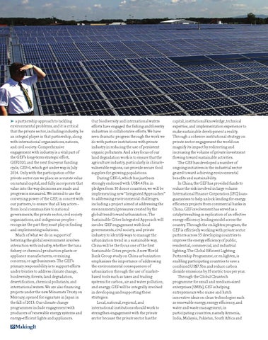 capital, institutional knowledge, technical expertise, and implementation experience to make sustainable development a reality. Through a cohesive institutional strategy on private sector engagement the world can magnify its impact by redirecting and increasing the volume of private investment flowing toward sustainable activities. The GEF has developed a number of ongoing initiatives in the industrial sector geared toward achieving environmental benefits and sustainability. In China, the GEF has provided funds to reduce the risk involved in large volume International Finance Corporation (IFC) loanguarantees to help unlock lending for energy efficiency projects from commercial banks in China. GEF involvement has served as a catalyst resulting in replication of an effective energy efficiency lending model across the country. Through the en.lighten program, the GEF is effectively working with private sector partners across 55 developing countries to improve the energy efficiency of public, residential, commercial, and industrial lighting. The Global Efficient Lighting Partnership Programme, or en.lighten, is enabling participating countries to save a combined US$7.5bn and reduce carbon dioxide emissions by 35 metric tons per year. Through the Global Cleantech programme for small and medium-sized enterprises (SMEs), GEF is helping entrepreneurs who nurse and hatch innovative ideas on clean technologies such as renewable energy, energy efficiency, and water and waste management, in participating countries, namely Armenia, India, Malaysia, Pakistan, South Africa and