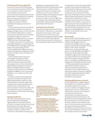 The value of financial remittances from African migrants abroad has grown significantly and now exceeds ODA. The potential to manage remittances for structural transformation is immense. Ethiopiaâs diaspora bond has succeeded in attracting hundreds of millions of dollars for the construction of the millennium dam project,
