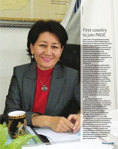 First country to join PAGE In June 2013, Mongolia became be the first country to join the United Nations Partnership for Action on Green Economy (PAGE), a major initiative to assist the global transition to a green economy. The initiative, between the UN Environment Programme, the UN Industrial Development Organization, the UN Institute for Training and Research, and the International Labour Organization is a direct response to the outcome document of the 2012 Rio+20 conference. The four UN agencies will provide a comprehensive suite of green economy services that will enable countries to transform their national economic structures to meet the growing demands and challenges of the 21st century. More specifically, PAGE will build enabling conditions in participating countries by shifting investment and policies towards the creation of a new generation of assets, such as clean technologies, resource-efficient infrastructure, wellfunctioning ecosystems, green skilled labour and good governance. PAGE will initially focus on seven pilot countries and then expand to assist 30 countries by 2020. Speaking at the National Implementation Workshop to Advance a Green Economy and Green Development in Mongolia in Ulaanbaatar in May 2014, Sanjaasuren Oyun highlighted the momentum in Mongolia to advance green development referring, in particular, to the Green Development Strategy, which she expected to be adopted by Parliament in June 2014. “Green economy and green development are not only the priority for the Ministry of Environment and Green Development, but are also becoming important for other ministries�, Minister Oyun stated, citing the construction of green and energy-efficient buildings as an example where the collaboration of government, the private sector and international partners such as PAGE can advance green development.
