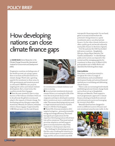 very specific financing needs. On one hand, green economy initiatives have the potential to bring returns on capital investments and so can attract private finance. On the other, climate resilience is often a public good, and would ordinarily need public finance in the form of grants. Over the past year the IIED has worked with seven countries â Bangladesh, Ethiopia, Kenya, Nepal, Rwanda, The Gambia and Zanzibar â to identify ways public sector actors can respond to this context and the emerging appetite for investment in these areas. In March 2014, policymakers met in Addis Ababa and identified the following three steps: