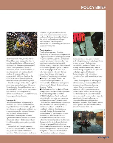 climate resilience and green economy goals into planning and budgetary systems in order to ensure the long-term sustainability of climate finance, and to manage funds more effectively. Nepal’s climate change budget code and Rwanda’s on-budget approach to finance disbursement provide interesting examples of how such systems can achieve this. These evolving trends in the design of intermediaries, economic and financial instruments and financial planning systems show how many developing nations are taking important steps to ensure they are ready to receive, manage and disburse climate finance from both public and private sources as they make the transition to climate-resilient, green economies. They are not just sitting waiting for money to flow. They are setting up the systems and institutions that will create new money from old. Photo: Sudipto Das