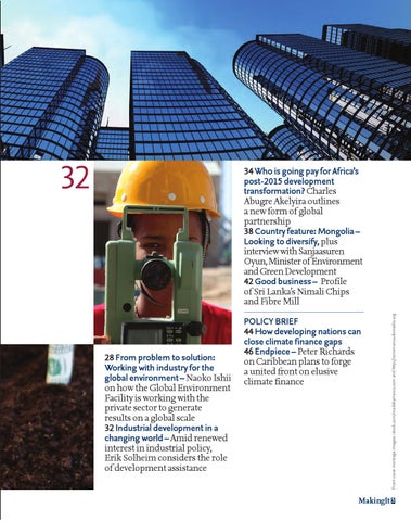 28 From problem to solution: Working with industry for the global environment – Naoko Ishii on how the Global Environment Facility is working with the private sector to generate results on a global scale 32 Industrial development in a changing world – Amid renewed interest in industrial policy, Erik Solheim considers the role of development assistance