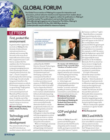 The Global Forum section of Making It is a space for interaction and discussion, and we welcome reactions and responses from readers about any of the issues raised in the magazine. Letters for publication in Making It should be marked ‘For publication’, and sent either by email to: editor@makingitmagazine.net or by post to: The Editor, Making It, Room D2142, UNIDO, PO Box 300, 1400 Wien, Austria. (Letters/emails may be edited for reasons of space).