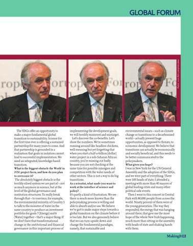 implementing the development goals, we will terribly misinvest and mistarget. Let’s discover the co-benefits. Let’s show the numbers. We’re sometimes running around like headless chickens, well-meaning but yet forgetting that when you start a half-a-billion [dollar] water project in a sub-Saharan African country, you’re missing out badly because you are not checking at the same time for possible synergies and competition with the water needs of other sectors. This is not a way to do big transitions. As a scientist, what made you want to work at the interface of science and policy? It’s partly a kind of frustration. We see there is much more known than the policymaking process is willing and able to absorb and/or use. We believe we’ve got to make major steps towards a global transition on the climate before it is too late. But we also genuinely believe that we can turn upside down and change the fundamental paradigm, namely, that sustainable and