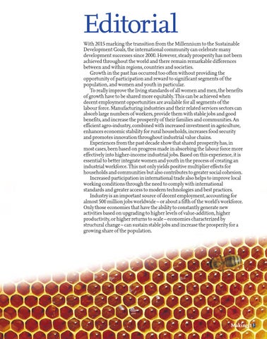 Editorial With 2015 marking the transition from the Millennium to the Sustainable Development Goals, the international community can celebrate many development successes since 2000. However, steady prosperity has not been achieved throughout the world and there remain remarkable differences between and within regions, countries and societies. Growth in the past has occurred too often without providing the opportunity of participation and reward to significant segments of the population, and women and youth in particular. To really improve the living standards of all women and men, the benefits of growth have to be shared more equitably. This can be achieved when decent employment opportunities are available for all segments of the labour force. Manufacturing industries and their related services sectors can absorb large numbers of workers, provide them with stable jobs and good benefits, and increase the prosperity of their families and communities. An efficient agro-industry, combined with increased investment in agriculture, enhances economic stability for rural households, increases food security and promotes innovation throughout industrial value chains. Experiences from the past decade show that shared prosperity has, in most cases, been based on progress made in absorbing the labour force more effectively into higher-income industrial jobs. Based on this experience, it is essential to better integrate women and youth in the process of creating an industrial workforce. This not only yields positive multiplier effects for households and communities but also contributes to greater social cohesion. Increased participation in international trade also helps to improve local working conditions through the need to comply with international standards and greater access to modern technologies and best practices. Industry is an important source of decent employment, accounting for almost 500 million jobs worldwide – or about a fifth of the world’s workforce. Only those economies that have the ability to constantly generate new activities based on upgrading to higher levels of value-addition, higher productivity, or higher returns to scale – economies characterized by structural change – can sustain stable jobs and increase the prosperity for a growing share of the population.