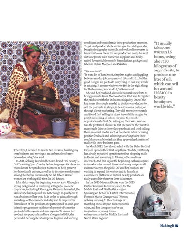 “We can do it” “It was a lot of hard work, sleepless nights and juggling between my day job, my personal life and Izil…But the good thing is we got to do everything in our way, which is amazing. It means whatever we feel is the right thing for the business, we can do it,” Abbassy said. She and her husband also took painstaking efforts to bring products from Morocco to the UAE and to register the products with the Dubai municipality. One of the key issues the couple needed to decide was whether to sell the products in shops, in beauty salons, online, or through direct marketing. They did extensive research and found that selling in shops leaves little margin for profit and selling in salons requires too much organizational effort. So setting up their own venture was the preferred choice. To test the waters, they went to many trade fairs to show their products and tried selling them on social media such as Facebook. After receiving positive feedback and achieving satisfying sales, their confidence was boosted and they approached a series of malls with their business plan. In March 2013, they closed a deal with the Dubai Festival City and opened their first shop there. To-date, Izil Beauty has already expanded operations to four shopping malls in Dubai, and according to Abbassy, other malls are interested. And that is just the beginning. Abbassy aspires to introduce the natural Moroccan beauty recipes to all customers across the globe. She and her husband are working to expand the venture and to launch an e-commerce platform so that Izil Beauty products are easily accessible wherever there is Internet. In late 2015 Mouna Abbassy won the 2015 Cartier Women’s Initiative Award for the Middle East and North Africa region. Speaking on behalf of Cartier International, Florence Marin Granger said, “Mouna Abbassy is rising to the challenge of matching social impact with economic value, and her company can be an inspiration to young female entrepreneurs in the Middle East and North Africa region.”