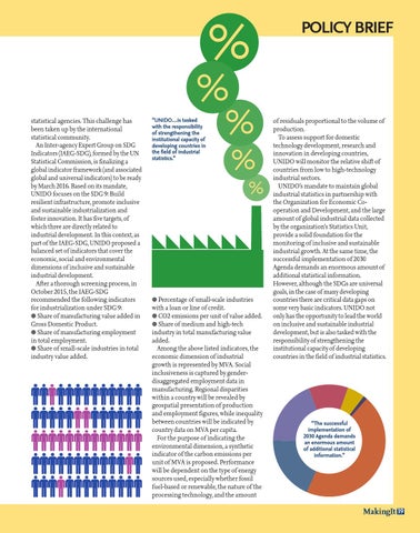 % statistical agencies. This challenge has been taken up by the international statistical community. An Inter-agency Expert Group on SDG Indicators (IAEG-SDG), formed by the UN Statistical Commission, is finalizing a global indicator framework (and associated global and universal indicators) to be ready by March 2016. Based on its mandate, UNIDO focuses on the SDG 9: Build resilient infrastructure, promote inclusive and sustainable industrialization and foster innovation. It has five targets, of which three are directly related to industrial development. In this context, as part of the IAEG-SDG, UNIDO proposed a balanced set of indicators that cover the economic, social and environmental dimensions of inclusive and sustainable industrial development. After a thorough screening process, in October 2015, the IAEG-SDG recommended the following indicators for industrialization under SDG 9: l Share of manufacturing value added in Gross Domestic Product. l Share of manufacturing employment in total employment. l Share of small-scale industries in total industry value added.