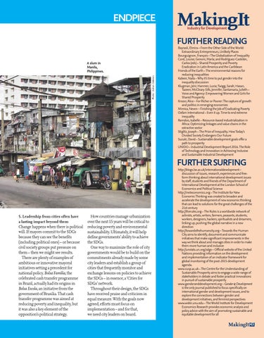 http://blogs.lse.ac.uk/internationaldevelopment – discussion of issues, research, experiences and freeform thinking about international development issues by staff, students and friends of the Department of International Development at the London School of Economics and Political Science http://ineteconomics.org – The Institute for New Economic Thinking was created to broaden and accelerate the development of new economic thinking that can lead to solutions for the great challenges of the 21st century http://therules.org – The Rules is a worldwide network of activists, artists, writers, farmers, peasants, students, workers, designers, hackers, spiritualists and dreamers, linking up, pushing the global narrative in a new direction http://towardsthehumancity.org – Towards the Human City aims to identify, document and communicate initiatives that make significant improvements in the way we think about and manage cities in order to make them more human and inclusive http://unstats.un.org/sdgs – Official website of the United Nations providing information on the development and implementation of an indicator framework for global monitoring of the post-2015 development agenda. www.cusp.ac.uk – The Centre for the Understanding of Sustainable Prosperity aims to engage a wide-range of stakeholders in debate and foster practical innovations in pursuit of sustainable prosperity www.genderanddevelopment.org – Gender & Development is the only journal published to focus specifically on international gender and development issues, and to explore the connections between gender and development initiatives, and feminist perspectives www.wider.unu.edu – The World Institute for Development Economics Research provides economic analysis and policy advice with the aim of promoting sustainable and equitable development for all