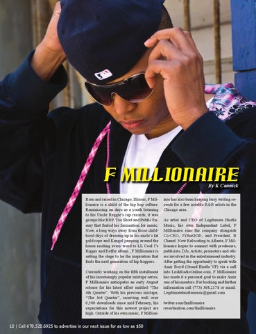 Born and raised in Chicago, Illinois, F Millionaire is a child of the hip hop culture. Reminiscing on days as a youth listening to his Uncle Reggie’s rap records; it was groups like BDP, Too Short and Public Enemy that fueled his fascination for music. Now, a long ways away from those childhood days of dressing up in his uncle’s fat gold rope and Kangol jumping around the house reciting every word to LL Cool J’s Bigger and Deffer album , F Millionaire is setting the stage to be the inspiration that fuels the next generation of hip hoppers. Currently working on the fifth installment of his increasingly popular mixtape series, F Millionaire anticipates an early August release for his latest effort entitled “The 4th Qaurter”. With his previous mixtape, “The 3rd Quarter”, receiving well over 6,500 downloads since mid February, his expectations for this newest project are high. Outside of his own music, F Million10 | Call 678.528.6925 to advertise in our next issue for as low as $50