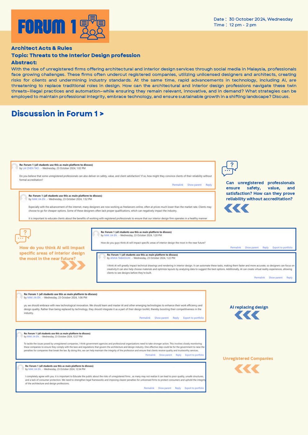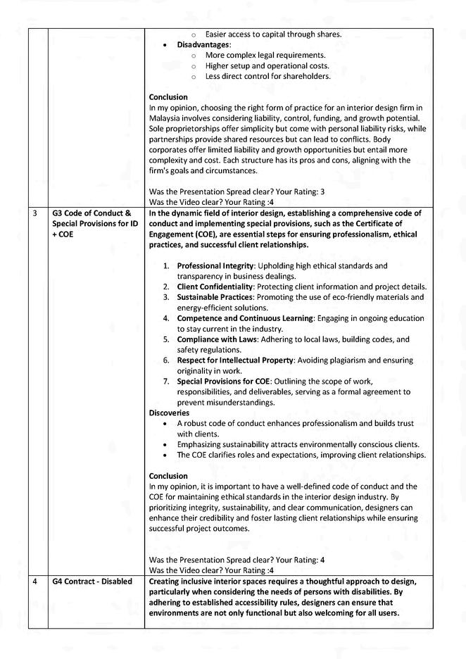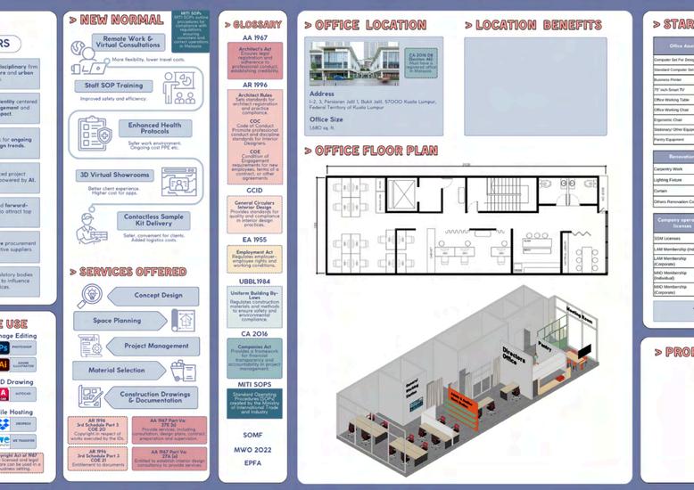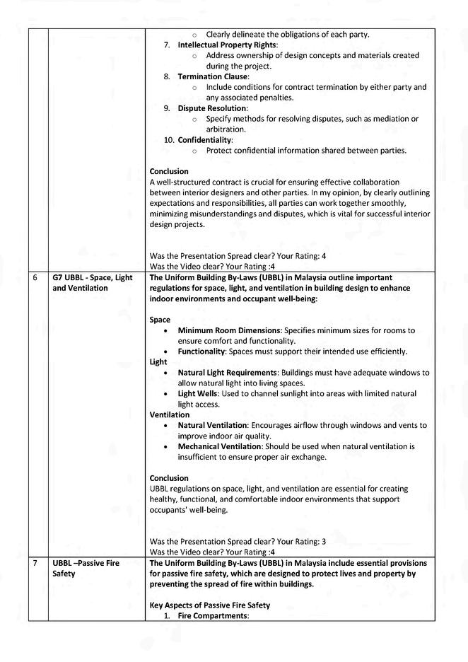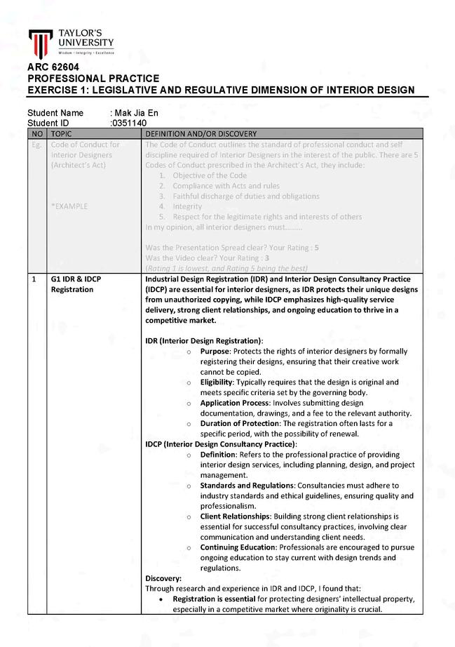 ThisassignmentintroducesstudentstotheProfessionalConductandPracticestandards expected of Interior Designers registered with the Board of Architects (Lembaga Arkitek Malaysia). It emphasizes the importance of understanding contractual, professional, and legislative terms used in interactions with clients, contractors, peers, authorities, and the public.StudentswillreferencekeydocumentssuchastheArchitectsAct1967,Architects Rules 1996, Uniform Building By-Laws 1984, PAM/MIID Contracts, and other relevant regulations.